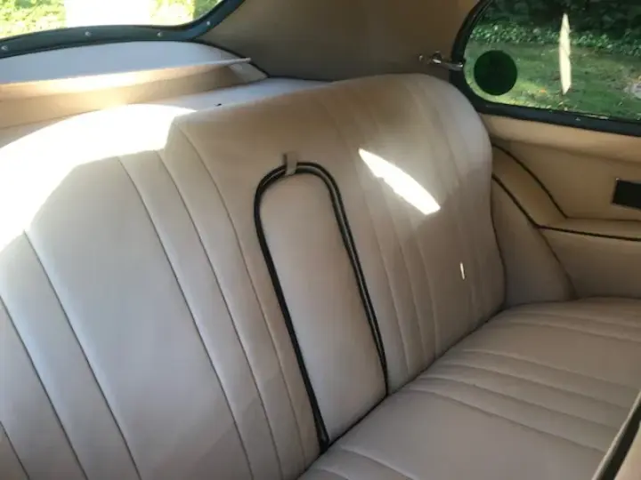 The interior is trimmed in beige leather, with seats and door cards finished with contrasting dark piping. The upholstery presents well, retaining a correct period appearance with light, even patination consistent with careful ownership. The light interior contrasts attractively with the exterior and contributes to a calm, refined cabin environment.