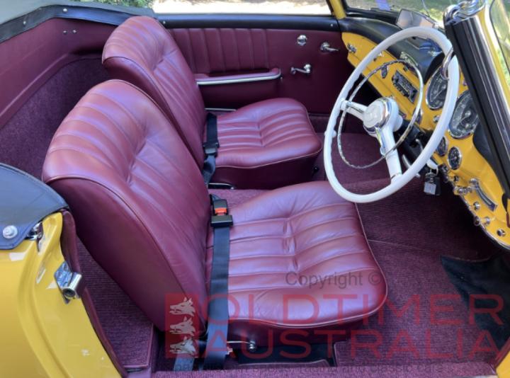 The interior of the car is also beautifully presented. The red upholstery provides a perfect colour contrast to the yellow paintwork, particularly the dash. All of the instruments and controls, including the delicate trade mark Mercedes-Benz steering wheel present like new. Everything looks to be in working order.