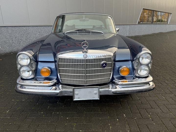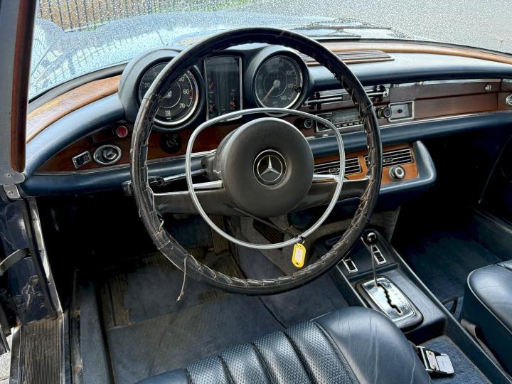 Het betreft een Matching nummers Lage grille (Flachkühler) 280SE Coupe, alleen geproduceerd in 1970/71, af fabriek geleverd in lichtblauw metallic 906G en in het verleden gewijzigd in Donkerblauw metallic 387H, het lakwerk is redelijk en hoeft niet vervangen te worden, een auto die goed loopt en rijdt, betreft een automatic transmissie met de handle op de tunnel en niet aan de het stuur, het leder interieur is best vrij aardig, zo ook tapijt en binnen hemel, voorzien van de originele Becker radio, qua body in zoverre ik kan zien geen schade gehad in het verleden, voorzien van het juiste type bumpers, de kofferbodem hoeken zijn in het verleden vervangen, de hoofd kofferbodem, achter tussen-paneel en achter schermen zijn nog de eerste en origineel, aan de onderzijde kan ie wat verbeteringen gebruiken, niet zo zeer de hoofdbodem delen, te denken is dan aan de voorste krik steunen, links voor de binnen scherm versteviging (banaan genoemd), en l + R een liggend gedeelte net voor het achterwiel.