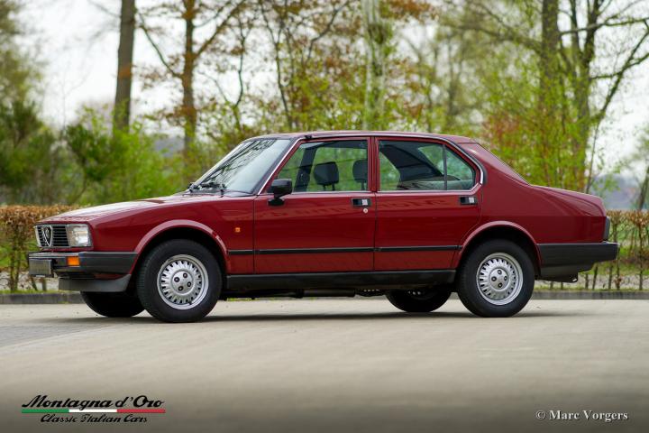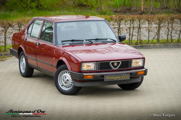 Alfa Romeo Alfetta 1.8 Berlina, jaar 1984 (eerste registratie 27-04-1984). Chassisnummer * ZAR01687 * 08520X *, motornummer AR01678 * 08520X *. Kleur Rosso Veneziano 536. Deze prachtige Alfa Romeo Alfetta werd nieuw verkocht in Italië. De auto is onlangs gekocht van de eerste eigenaar, de heer Giuseppe uit Ragusa. Deze Alfetta 1.8 Berlina verkeert in een fantastische en volledig originele staat en de auto heeft vanaf nieuw slechts 69.706 kilometer gereden. De Alfa Romeo Alfetta is een sportieve klassieke sedan met mechanische details van een sportwagen … Een aluminium viercilindermotor met dubbele bovenliggende nokkenassen, een 5-traps “transaxle” -versnellingsbak vlak voor de achterwielen voor 50-50 gewichtsverdeling, schijfremmen rondom en een de-Dion achteras. De auto rijdt, stuurt, en remt perfect! De automobiel verkeert in excellente originele conditie! De carrosserie is perfect en toont zijn originele lak, het interieur vertoont nagenoeg geen gebruikssporen. Deze prachtige Alfa Romeo Alfetta 1.8 Berlina wordt geleverd met de originele boekjes en twee sets sleutels. Een zeldzame vondst voor de Alfa Romeo liefhebber en/ of verzamelaar!
