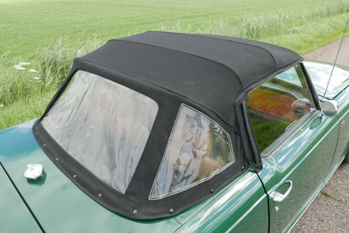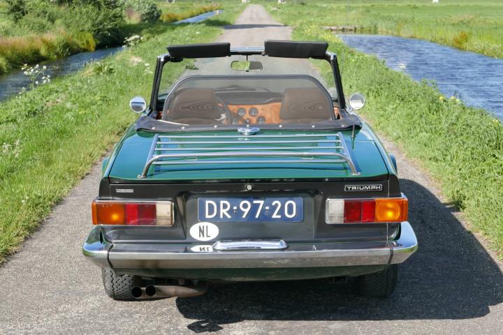 A true sight to behold: the beautiful lines of the TR6 in a classic and highly desirable color scheme. The car is finished in British Racing Green, which pairs elegantly with the beige (imitation leather) upholstery, wood trim in the interior, and shiny wire wheels. Both the paintwork and the chrome, rubber seals, and lights are in excellent and fresh condition. The black mohair soft top is of high quality and also in excellent condition. At the front, Hella spotlights have been fitted. At the rear, a luggage rack is installed. Union Jack emblems proudly adorn the sides.