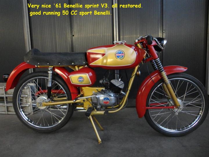 heel goede 61 benelli sprint V3. Geheel gerestaureerd. Goed rijdende 50 CC sport benelli. Grootste keus in ECHTE klassiekers met meer dan 450 stuks in "de Stolze Collectie", van project tot perfect !
