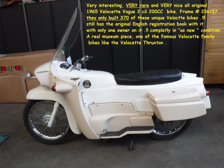Zeer interessante, ZEER zeldzame en HEEL mooie geheel originele 1965 Velocette Vogue 2 cil 200CC bike. Er zijn slechts 370 van deze unieke Velocette motoren gebouwd !Heeft nog het originele Engelse registratie boek er bij met slechts één eigenaar erin. Motor is volledig nog "als nieuw" .Een echt museumstuk, een lid van de beroemde Velocette familie zoals bijv.de Velocette Thruxton. Grootste keus in ECHTE klassiekers met meer dan 450 stuks in "de Stolze Collectie", van project tot perfect !