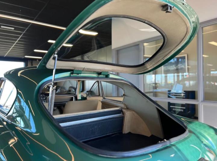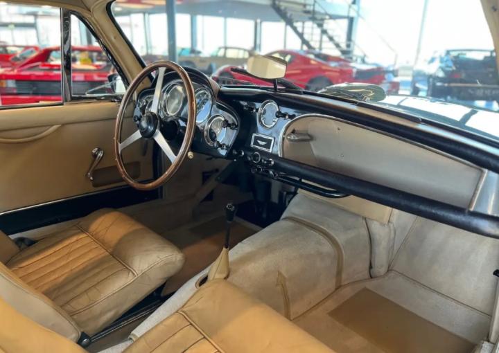 Das Innere des Autos ist genauso schön. Vor allem in Anbetracht der einzigartigen Tatsache, dass dies eine originale erste Innenausstattung ist. Das Leder hat eine schöne Patina, die Teppiche sind in gutem Zustand, ebenso das Armaturenbrett und die Instrumententafel. Der Dachhimmel ist mit Filz bezogen, der sich ebenfalls in einem sehr guten Zustand befindet. Dinge wie das Lenkrad und der Schalthebel für das Getriebe sind ebenfalls komplett original und sehen wunderschön aus.