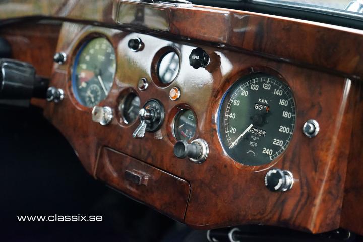 Interior: If you're around 175 cm (5'9") or taller, you might find it challenging to fit into a standard Jaguar XK120 Fixed Head Coupe. However, this car features special bucket seats, offering extra legroom and headroom, making it much more comfortable for taller drivers. These seats are also great for long journeys. Hooks are in place for proper seat belts. The interior features a beautiful wood dashboard with fully functional Smiths instruments and a Moto-Lita wooden steering wheel that is adjustable in height. The car also has a unique pedal configuration, with the gas pedal connected by a cable rather than a linkage, giving you a more connected driving experience. The slightly bulkier gearbox tunnel accommodates the overdrive.