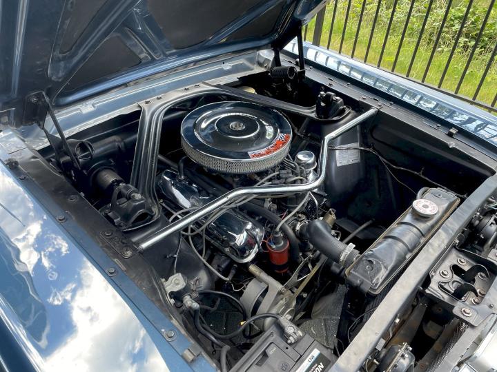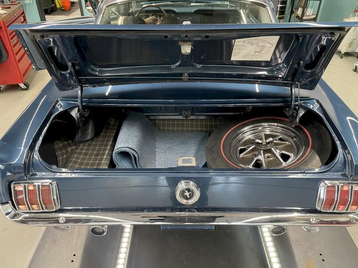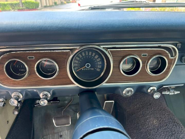 It has a wonderful Caspian blue metallic paint a matching two-tone blue with white Pony Deluxe interior that all looks really nice and clean the underside the floors are original and never replaced even the original red oxide is visible with the blue over spray exhausted fuel tank brake brakes some suspension parts renewed grill mounted foglight, correct GT Double exhaust system and a 4-speed manual transmission. This Fastback comes with a set of red wall tires, really cool.