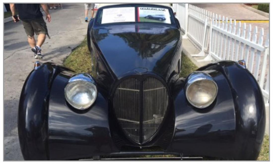 The prototype shown is for sale and includes steel wheels and new radial tires, Bugatti exact replica wheel covers (expensive Lamarr discs), tilt steering column installed with Borgeson steering linkage and steering wheel. Beautiful redwood dash, under cowl metal support structure, doors hinged and latched with door handles. Two small doors in top of cowl for easy under dash access. Body finished in black gel coat. Includes a pair of ’35 Chrysler headlights which have V-d lenses to match the V-d stainless Type 57s Bugatti grille. Replica Bugatti front fender marker lights. Fender skirts are available (see stunning white Bugatti we photographed at the Schlumpf Museum in France).
