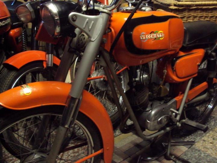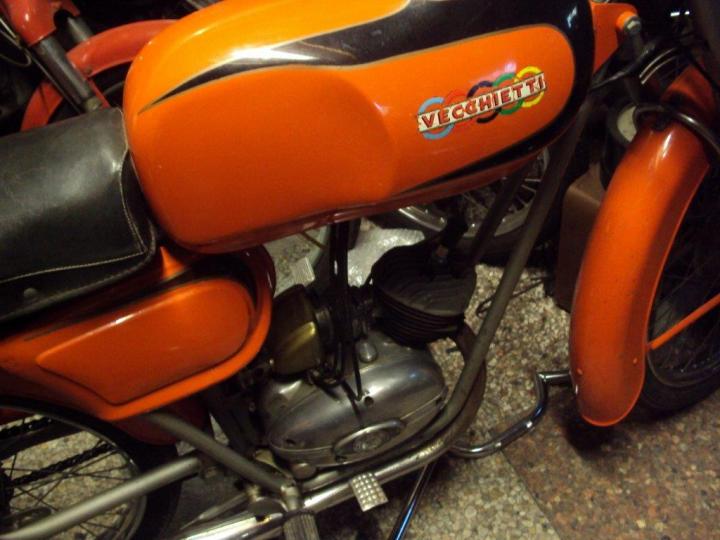 Een bijzondere brommer. Een oranje Vechietti. Hij staat hier te koop.Het frame is van een Negrini. Grote keus in motor- en bromfietsen in de Stolze Collectie!